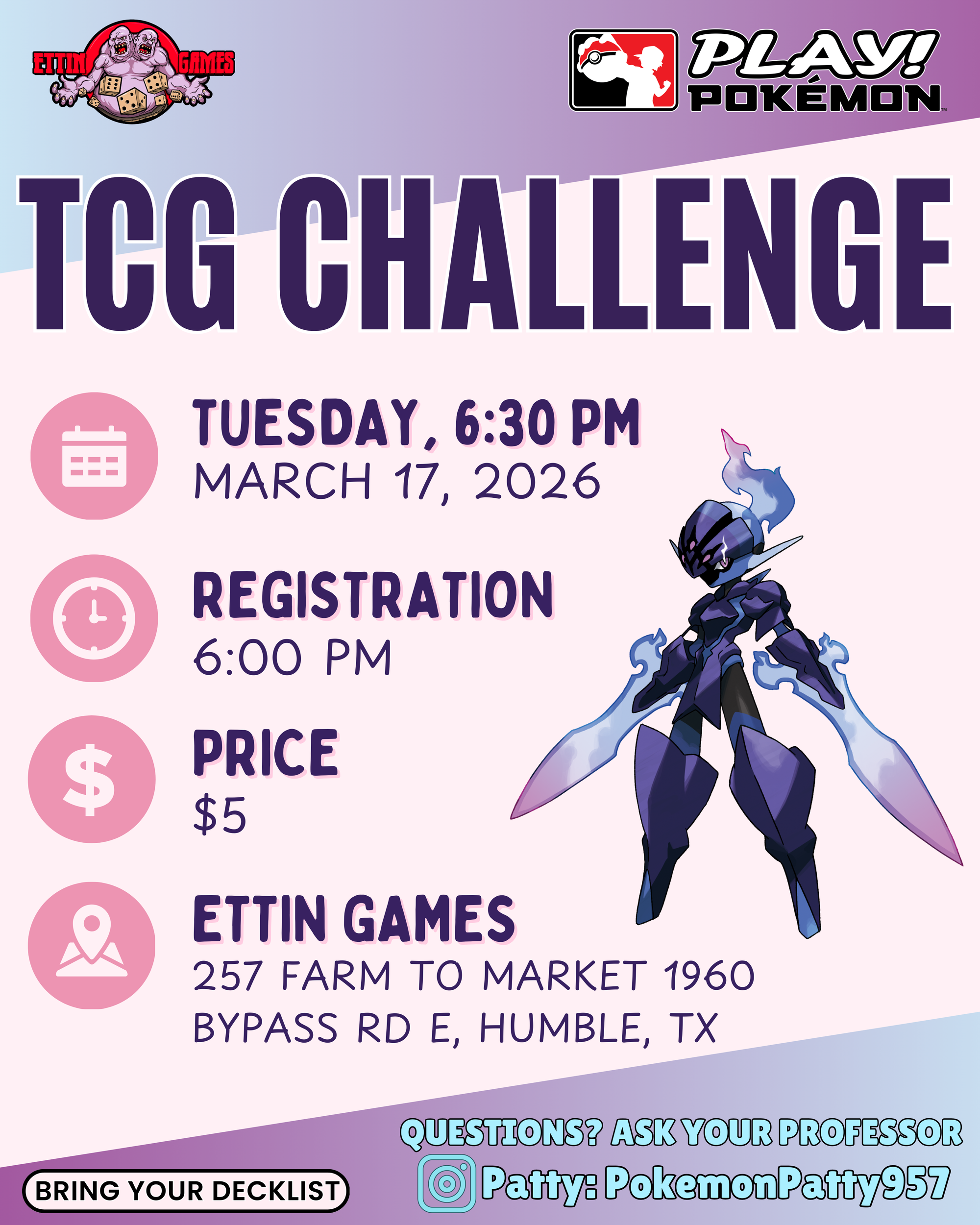 Good luck! Hope to see y'all this Tuesday! PSSST...we might be having some prismatic bundles FOR SALE for the first 20ish people that pre-register and play with us! Left over product will be available to the public once the event starts!